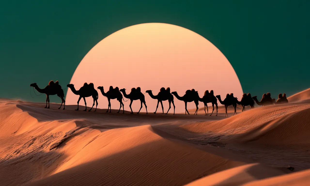| 낙타 행렬 근처 | 일몰 직전 | 움직이는 실루엣 | 영화적/드라마틱 | 🔥 매우 뜨거움 |